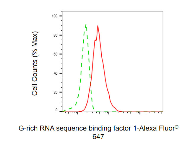 Flow cytometric analysis of G-rich RNA sequence binding factor 1 expression in HepG2 cells using G-rich RNA sequence binding factor 1 antibody. Green, isotype control; red, G-rich RNA sequence binding factor 1.