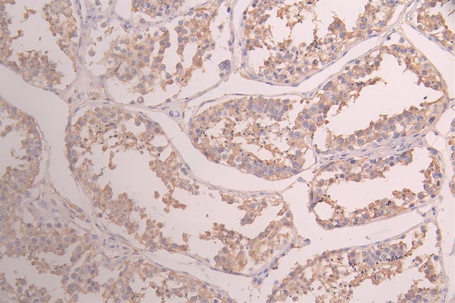 IHC image of CSB-RA009982MA1HU diluted at 1:100 and staining in paraffin-embedded human testis tissue performed on a Leica BondTM system. After dewaxing and hydration, antigen retrieval was mediated by high pressure in a citrate buffer (pH 6.0). Section was blocked with 10% normal goat serum 30min at RT. Then primary antibody (1% BSA) was incubated at 4°C overnight. The primary is detected by a Goat anti-human polymer IgG labeled by HRP and visualized using 0.05% DAB.