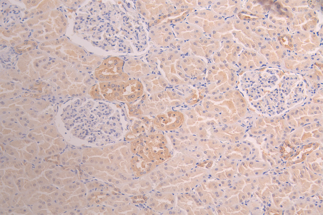 IHC image of CSB-RA009982MA1HU diluted at 1:100 and staining in paraffin-embedded human kidney tissue performed on a Leica BondTM system. After dewaxing and hydration, antigen retrieval was mediated by high pressure in a citrate buffer (pH 6.0). Section was blocked with 10% normal goat serum 30min at RT. Then primary antibody (1% BSA) was incubated at 4°C overnight. The primary is detected by a Goat anti-human polymer IgG labeled by HRP and visualized using 0.05% DAB.