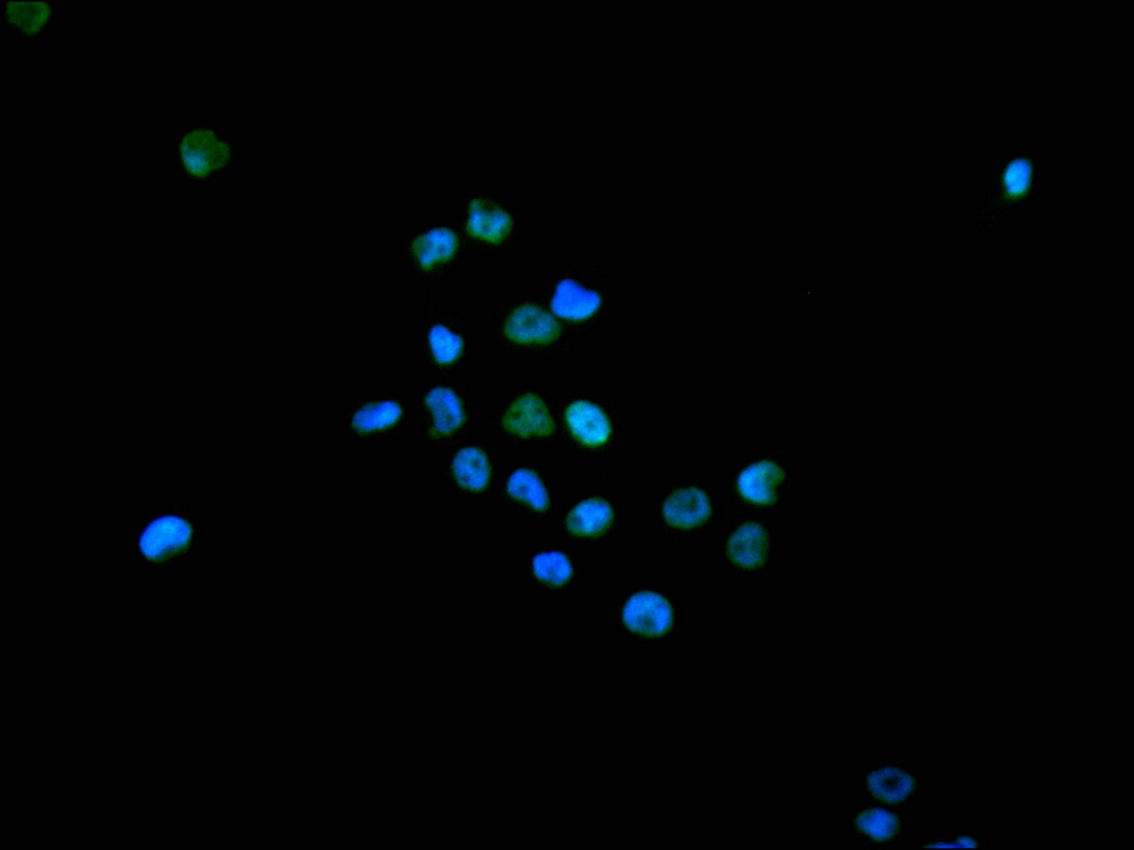 Immunofluorescence staining of A431 cell with CSB-RA135386A0HU at 1:50 , counter-stained with DAPI. The cells were fixed in 4% formaldehyde, permeabilized using 0.2% Triton X-100 and blocked in 10% normal Goat Serum. The cells were then incubated with the antibody overnight at 4°C. The secondary antibody was Alexa Fluor 488-congugated AffiniPure Goat Anti-Rabbit IgG(H+L).