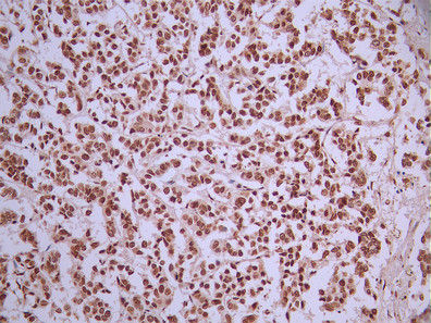 IHC image of CSB-RA135386A0HU diluted at 1:100 and staining in paraffin-embedded human breast cancer performed on a Leica BondTM system. After dewaxing and hydration, antigen retrieval was mediated by high pressure in a citrate buffer (pH 6.0). Section was blocked with 10% normal goat serum 30min at RT. Then primary antibody (1% BSA) was incubated at 4°C overnight. The primary is detected by a Goat anti-rabbit polymer IgG labeled by HRP and visualized using 0.05% DAB.