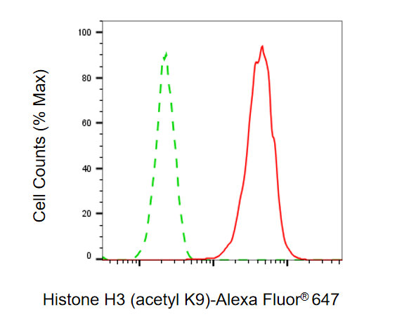 Flow cytometric analysis of Histone H3 (acetyl K9) expression in HAP-1 cells using Histone H3 (acetyl K9) antibody. Green, isotype control; red, Histone H3 (acetyl K9).