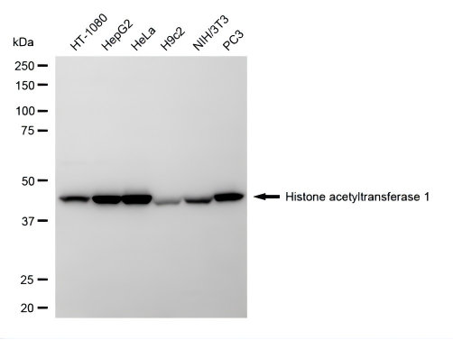 Western blotting analysis using histone acetyltransferase 1 antibody. Total cell lysates (30 μg) from various cell lines were loaded and separated by SDS-PAGE. The blot was incubated with histone acetyltransferase 1 antibody and HRP-conjugated goat anti-rabbit secondary antibody respectively.