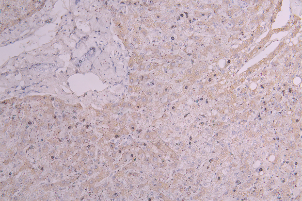 IHC image of CSB-RA010144MA1HU diluted at 1:300 and staining in paraffin-embedded human liver tissue performed on a Leica BondTM system. After dewaxing and hydration, antigen retrieval was mediated by high pressure in a citrate buffer (pH 6.0). Section was blocked with 10% normal goat serum 30min at RT. Then primary antibody (1% BSA) was incubated at 4°C overnight. The primary is detected by a Goat anti-Human IgG labeled by HRP and visualized using 0.05% DAB.