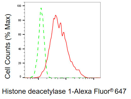 Flow cytometric analysis of Histone deacetylase 1 expression in C2C12 cells using Histone deacetylase 1 antibody. Green, isotype control; red, Histone deacetylase 1.