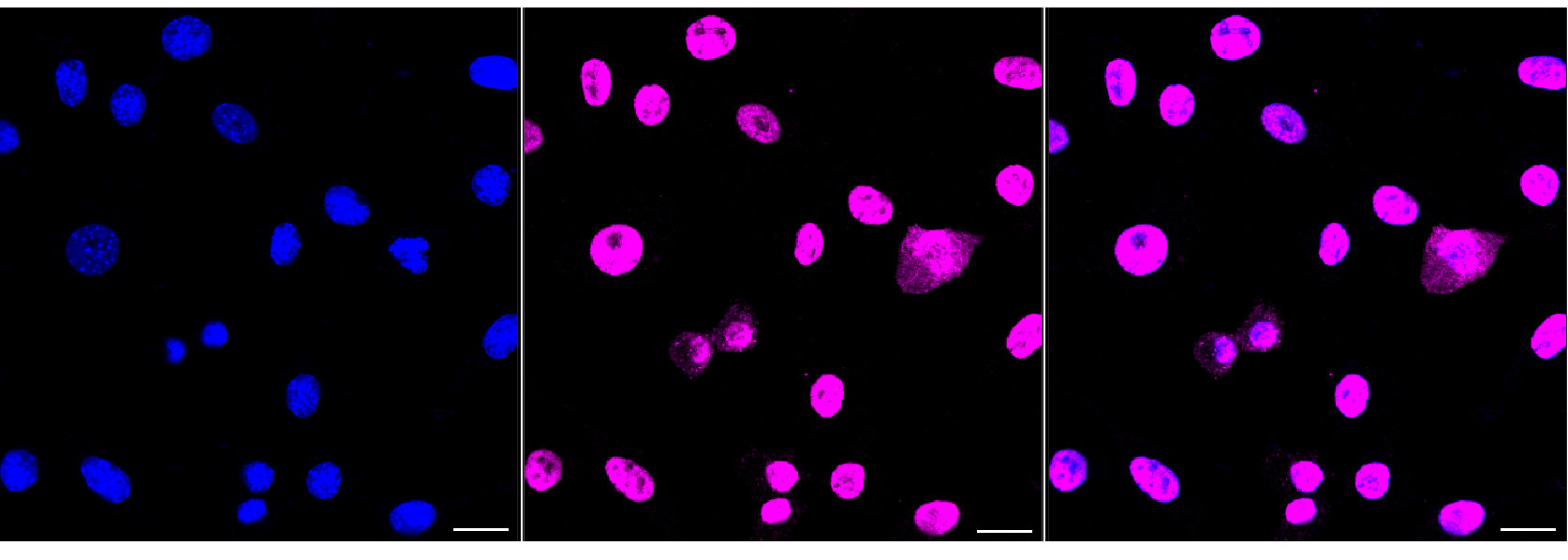 Immunocytochemical staining of C2C12 cells with Histone deacetylase 1 antibody. Nuclei were stained blue with DAPI; Histone deacetylase 1 was stained magenta with Alexa Fluor? 647. Images were taken using Leica stellaris 5. Protein abundance based on laser Intensity and smart gain: High. Scale bar, 20 μm.