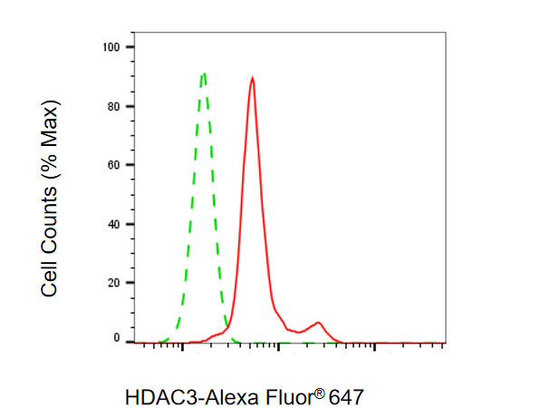 Flow cytometric analysis of HDAC3 expression in HepG2 cells using HDAC3 antibody. Green, isotype control; red, HDAC3.