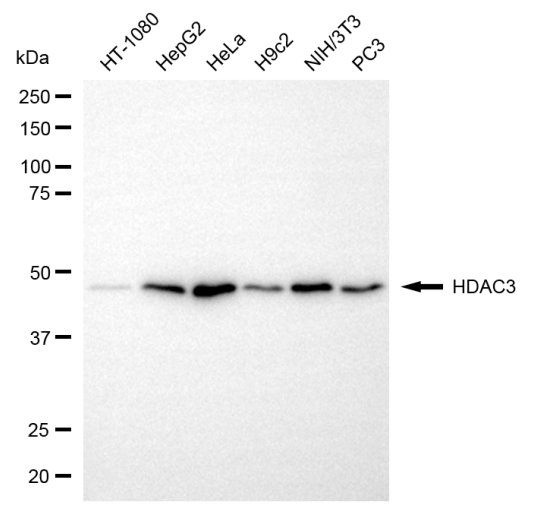 Western blotting analysis using HDAC3 antibody. Total cell lysates (30 μg) from various cell lines were loaded and separated by SDS-PAGE. The blot was incubated with HDAC3 antibody and HRP-conjugated goat anti-rabbit secondary antibody respectively.