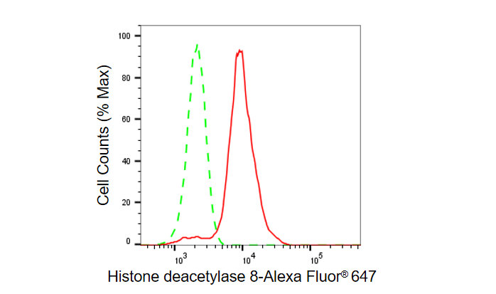 Flow cytometric analysis of Histone deacetylase 8 expression in HeLa cells using Histone deacetylase 8 antibody. Green, isotype control; red, Histone deacetylase 8.