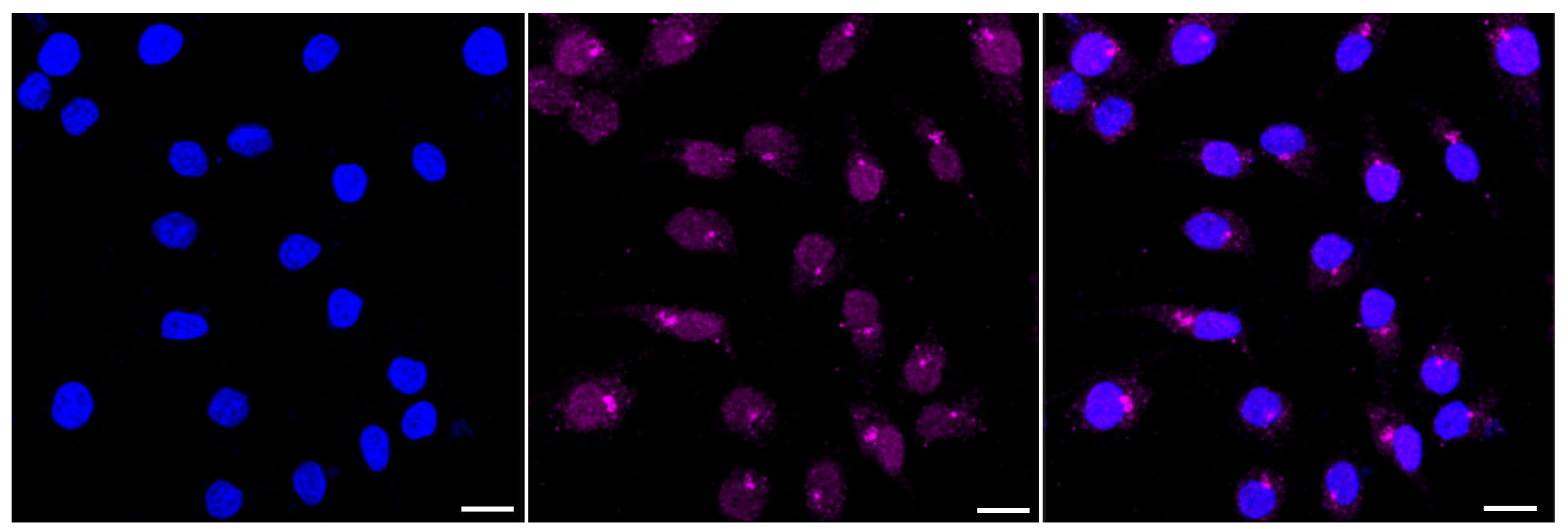 Immunocytochemical staining of HeLa cells with Histone deacetylase 8 antibody. Nuclei were stained blue with DAPI; Histone deacetylase 8 was stained magenta with Alexa Fluor? 647. Images were taken using Leica stellaris 5. Protein abundance based on laser Intensity and smart gain: Medium. Scale bar: 20 μm.