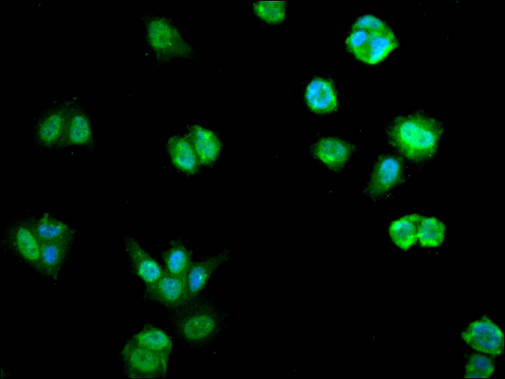 Immunofluorescence staining of MCF-7 cell with CSB-RA194900A0HU at 1:50, counter-stained with DAPI. The cells were fixed in 4% formaldehyde, permeabilized using 0.2% Triton X-100 and blocked in 10% normal Goat Serum. The cells were then incubated with the antibody overnight at 4°C. The secondary antibody was Alexa Fluor 488-congugated AffiniPure Goat Anti-Rabbit IgG(H+L).