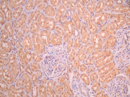 IHC image of CSB-RA299916A0HU diluted at 1:100 and staining in paraffin-embedded human kidney tissue performed on a Leica BondTM system. After dewaxing and hydration, antigen retrieval was mediated by high pressure in a citrate buffer (pH 6.0). Section was blocked with 10% normal goat serum 30min at RT. Then primary antibody (1% BSA) was incubated at 4°C overnight. The primary is detected by a Goat anti-rabbit polymer IgG labeled by HRP and visualized using 0.05% DAB.