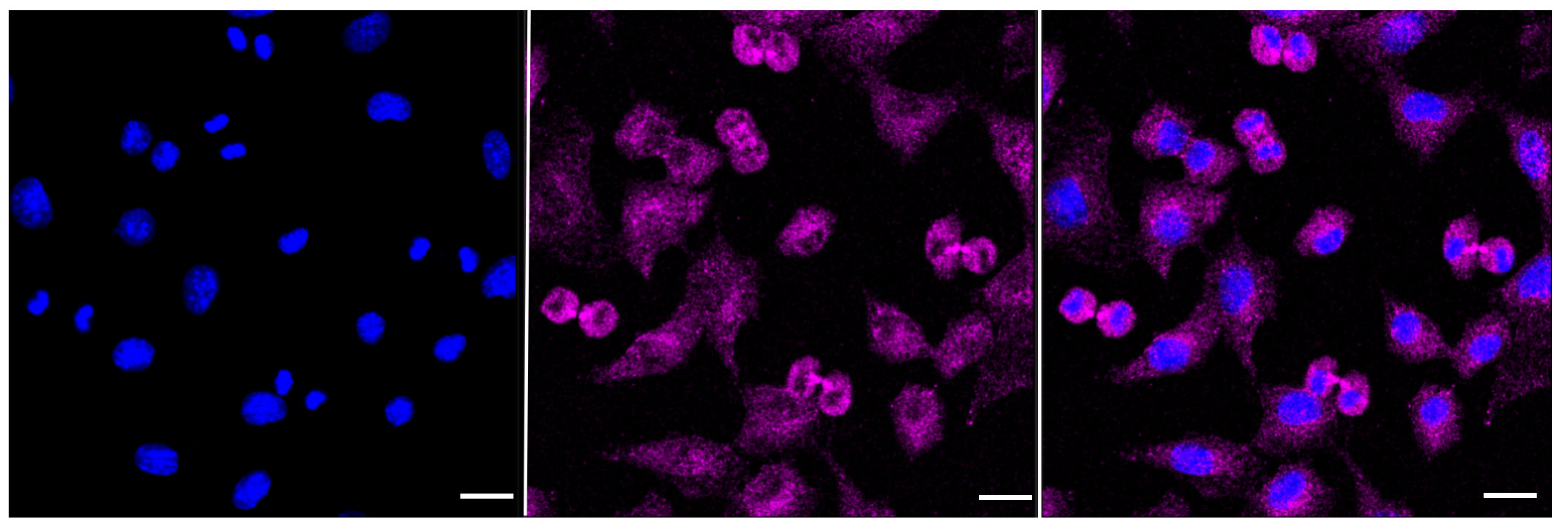 Immunocytochemical staining of C2C12 cells with Huntingtin interacting protein 1 antibody . Nuclei were stained blue with DAPI; Huntingtin interacting protein 1 was stained magenta with Alexa Fluor? 647. Images were taken using Leica stellaris 5. Protein abundance based on laser Intensity and smart gain: Low. Scale bar, 20 μm.