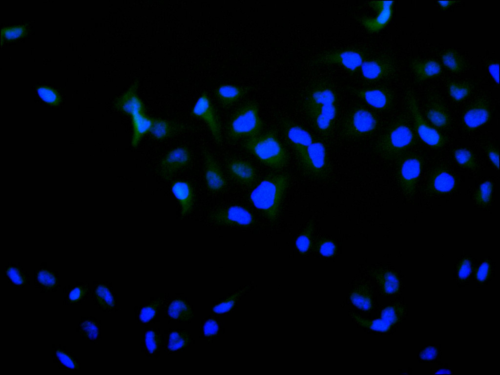 Immunofluorescence staining of HeLa cell with CSB-RA189750A0HU at 1:50 , counter-stained with DAPI. The cells were fixed in 4% formaldehyde, permeabilized using 0.2% Triton X-100 and blocked in 10% normal Goat Serum. The cells were then incubated with the antibody overnight at 4°C. The secondary antibody was Alexa Fluor 488-congugated AffiniPure Goat Anti-Rabbit IgG(H+L).