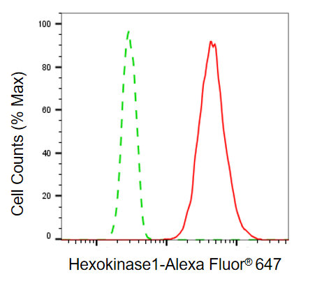 Flow cytometric analysis of hexokinase1 expression in HT-1080 cells using hexokinase1 antibody. Green, isotype control; red, hexokinase1.