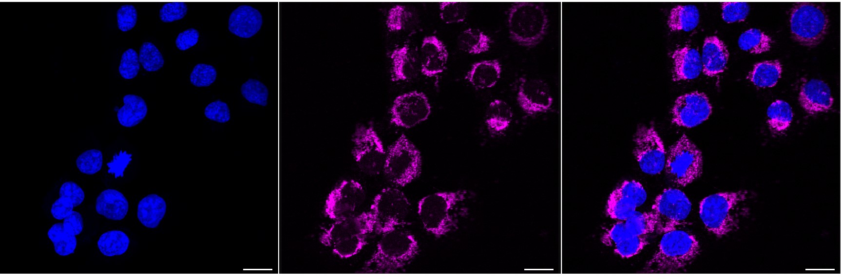 Immunocytochemical staining of HT-1080 cells with Hexokinase 1 antibody. Nuclei were stained blue with DAPI; Hexokinase 1 was stained magenta with Alexa Fluor? 647. Images were taken using Leica stellaris 5. Protein abundance based on laser Intensity and smart gain: High. Scale bar, 20 μm.
