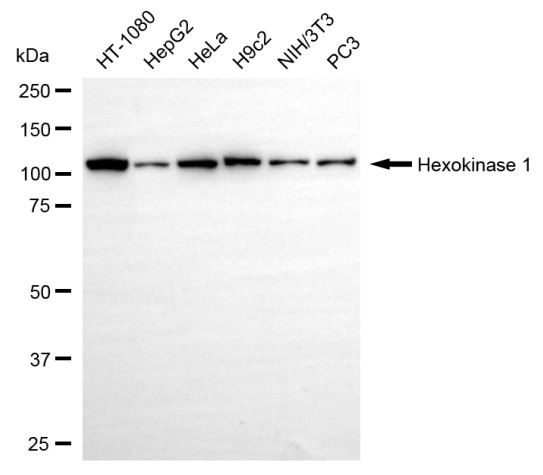 Western blotting analysis using hexokinase 1 antibody. Total cell lysates (30 μg) from various cell lines were loaded and separated by SDS-PAGE. The blot was incubated with hexokinase 1 antibody and HRP-conjugated goat anti-rabbit secondary antibody respectively.