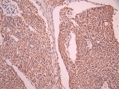 IHC image of CSB-RA045000A0HU diluted at 1:100 and staining in paraffin-embedded human lung cancer performed on a Leica BondTM system. After dewaxing and hydration, antigen retrieval was mediated by high pressure in a citrate buffer (pH 6.0). Section was blocked with 10% normal goat serum 30min at RT. Then primary antibody (1% BSA) was incubated at 4°C overnight. The primary is detected by a Goat anti-rabbit polymer IgG labeled by HRP and visualized using 0.05% DAB.