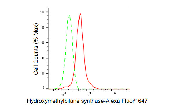 Flow cytometric analysis of Hydroxymethylbilane synthase expression in HeLa cells using Hydroxymethylbilane synthase antibody. Green, isotype control; red, Hydroxymethylbilane synthase.