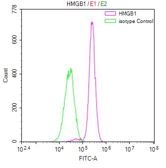 Overlay Peak curve showing Hela cells stained with CSB-RA010553MA1HU (red line) at 1:50. The cells were fixed in 4% formaldehyde (15min) and permeated by 0.2% TritonX-100 for 10min. Then 10% normal goat serum was Incubated to block non-specific protein-protein interactions followed by the antibody (1μg/1*106cells) for 45 min at 4°C. The secondary antibody used was FITC-conjugated Goat Anti-Mouse IgG(H+L) at 1/200 dilution for 35 min at 4°C. Isotype control antibody (green line) was mouse IgG1 (1μg/1*106cells) used under the same conditions. Acquisition of >10,000 events was performed.