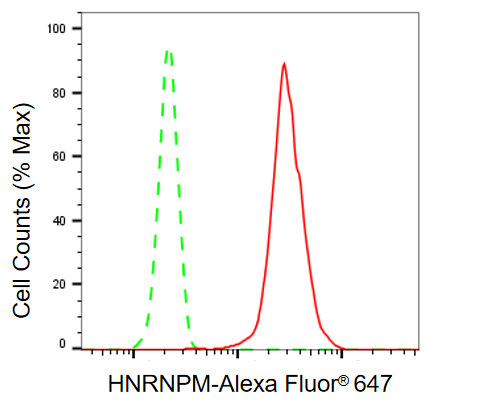 Flow cytometric analysis of HNRNPM expression in HepG2 cells using HNRNPM antibody. Green, isotype control; red, HNRNPM.