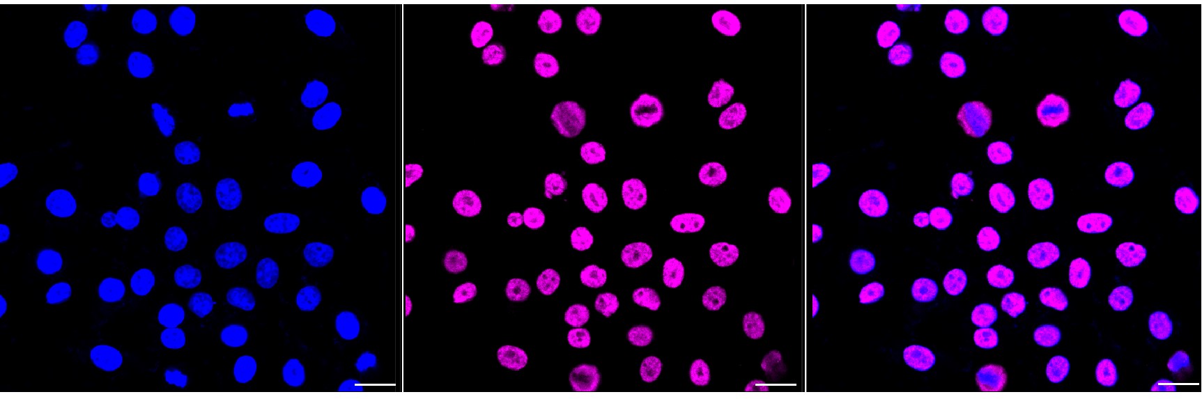 Immunocytochemical staining of Hela cells with HNRNPM antibody. Nuclei were stained blue with DAPI; HNRNPM was stained magenta with Alexa Fluor? 647. Images were taken using Leica stellaris 5. Protein abundance based on laser Intensity and smart gain: High. Scale bar, 20 μm.
