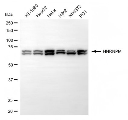Western blotting analysis using HNRNPM antibody. Total cell lysates (30 μg) from various cell lines were loaded and separated by SDS-PAGE. The blot was incubated with HNRNPM antibody and HRP-conjugated goat anti-rabbit secondary antibody respectively.