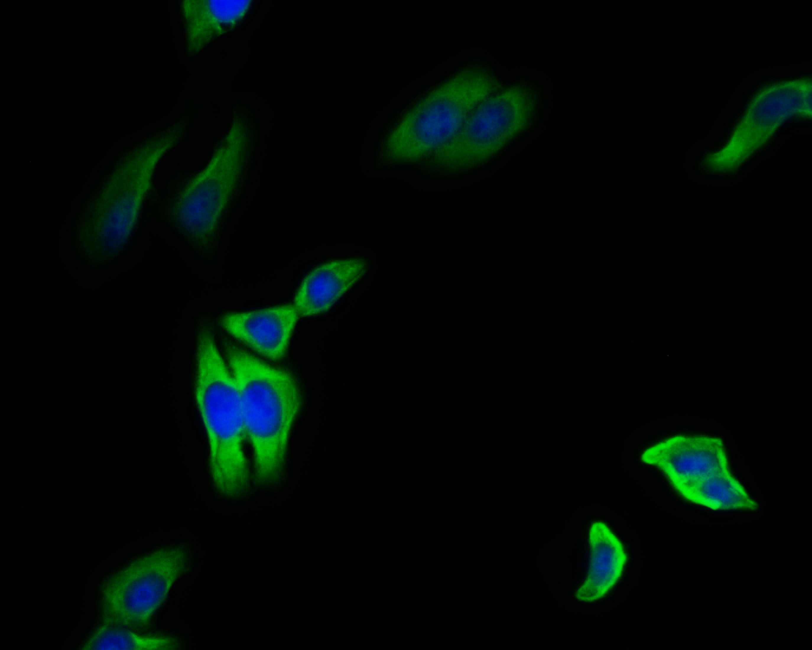 Immunofluorescence staining of HepG2 cell with CSB-RA904894A0HU at 1:50, counter-stained with DAPI. The cells were fixed in 4% formaldehyde and blocked in 10% normal Goat Serum. The cells were then incubated with the antibody overnight at 4°C. The secondary antibody was Alexa Fluor 495-congugated AffiniPure Goat Anti-Rabbit IgG(H+L).