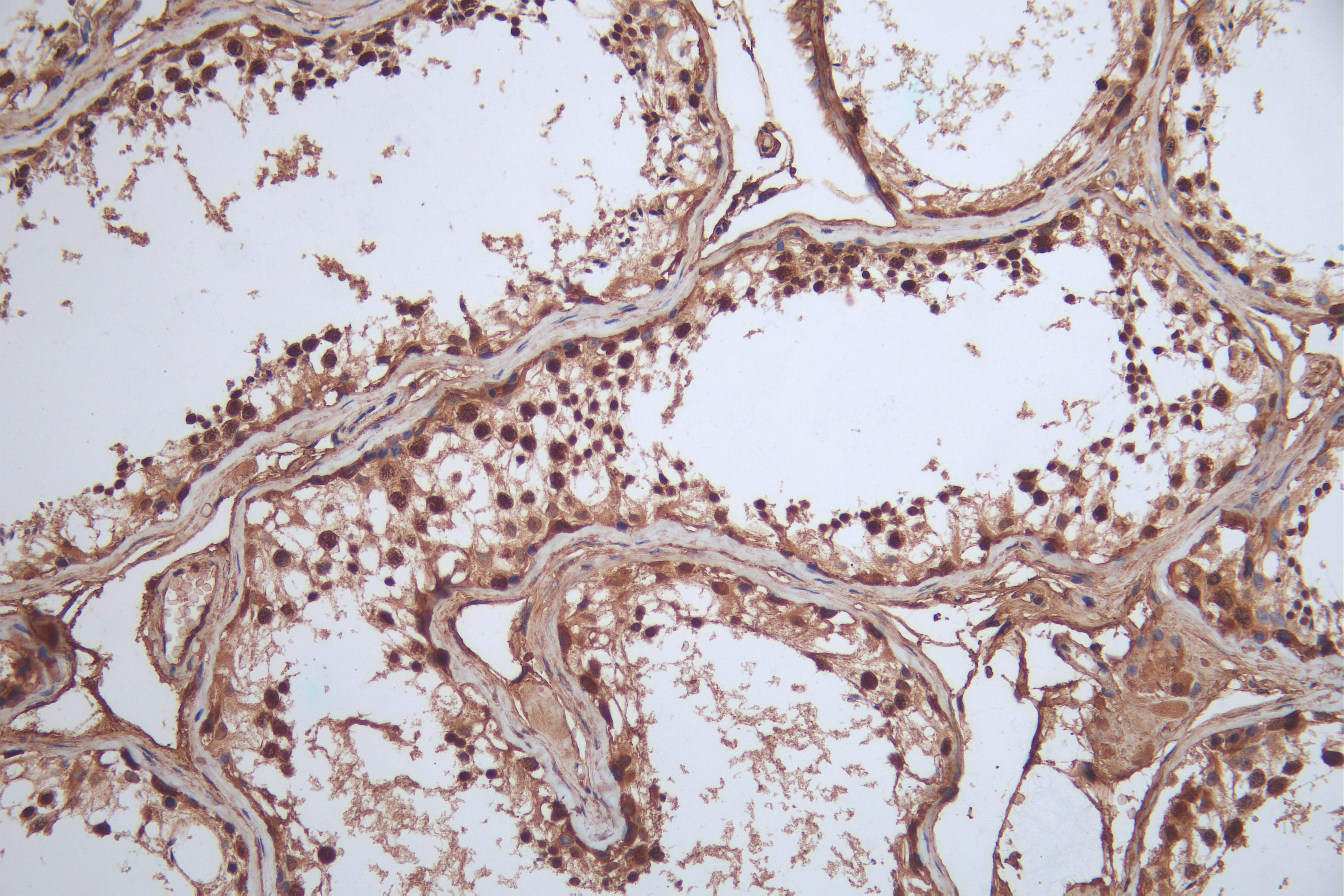IHC image of CSB-RA904894A0HU diluted at 1:100 and staining in paraffin-embedded human testis tissue performed on a Leica BondTM system. After dewaxing and hydration, antigen retrieval was mediated by high pressure in a citrate buffer (pH 6.0). Section was blocked with 10% normal goat serum 30min at RT. Then primary antibody (1% BSA) was incubated at 4°C overnight. The primary is detected by a Goat anti-rabbit polymer IgG labeled by HRP and visualized using 0.05% DAB.