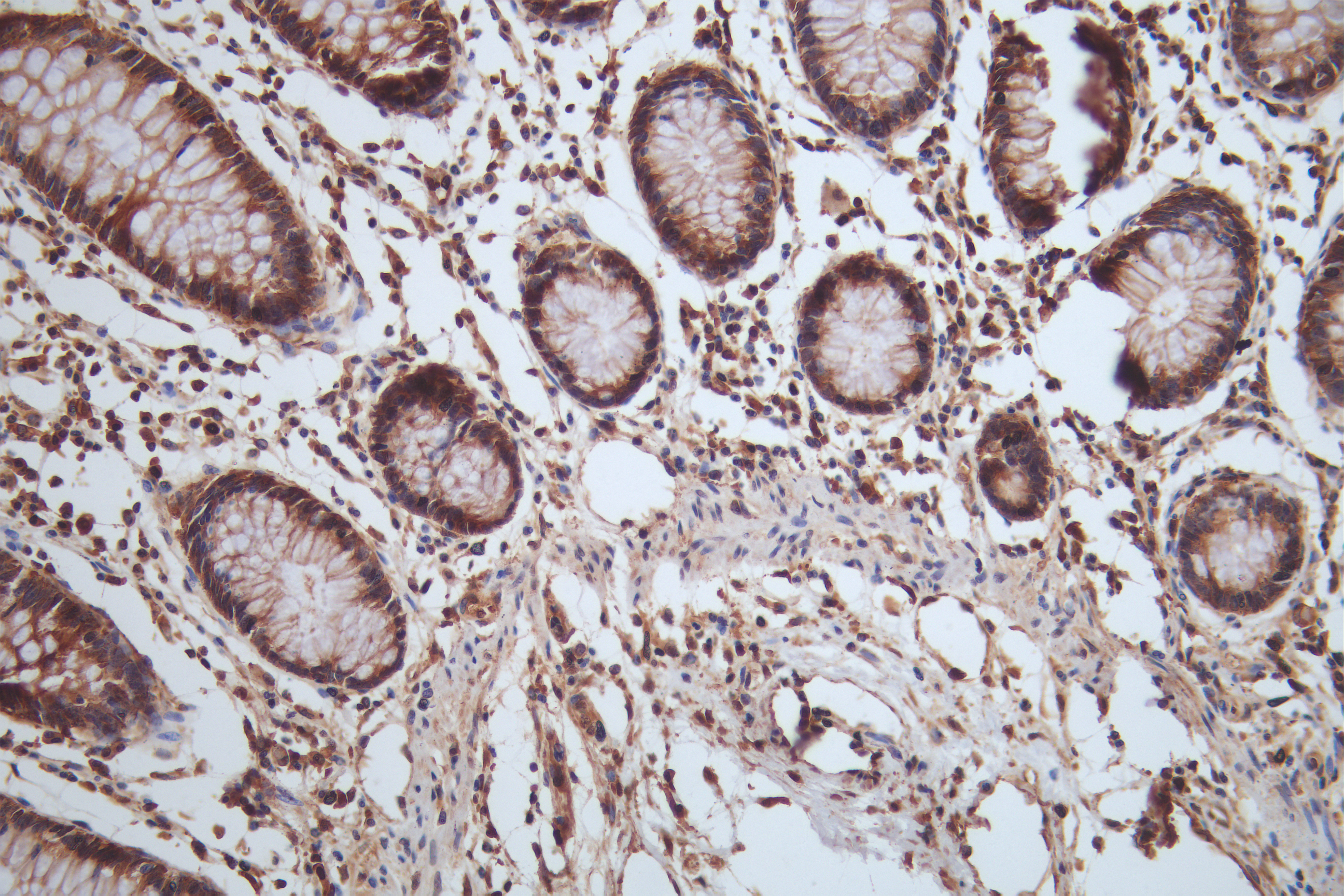 IHC image of CSB-RA904894A0HU diluted at 1:100 and staining in paraffin-embedded human colon tissue performed on a Leica BondTM system. After dewaxing and hydration, antigen retrieval was mediated by high pressure in a citrate buffer (pH 6.0). Section was blocked with 10% normal goat serum 30min at RT. Then primary antibody (1% BSA) was incubated at 4°C overnight. The primary is detected by a Goat anti-rabbit polymer IgG labeled by HRP and visualized using 0.05% DAB.