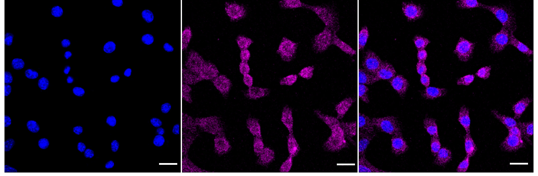Immunocytochemical staining of C2C12 cells with HSPA12A antibody . Nuclei were stained blue with DAPI; HSPA12A was stained magenta with Alexa Fluor? 647. Images were taken using Leica stellaris 5. Protein abundance based on laser Intensity and smart gain: Low. Scale bar, 20 μm.