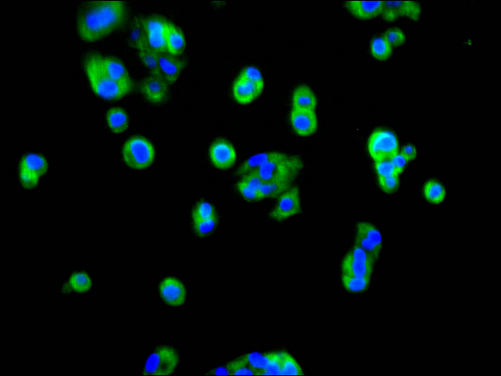 Immunofluorescence staining of HepG2 cell with CSB-RA270924A0HU at 1:50 , counter-stained with DAPI. The cells were fixed in 4% formaldehyde, permeabilized using 0.2% Triton X-100 and blocked in 10% normal Goat Serum. The cells were then incubated with the antibody overnight at 4°C. The secondary antibody was Alexa Fluor 488-congugated AffiniPure Goat Anti-Rabbit IgG(H+L).