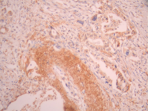 IHC image of CSB-RA270924A0HU diluted at 1:100 and staining in paraffin-embedded human pancreatic cancer performed on a Leica BondTM system. After dewaxing and hydration, antigen retrieval was mediated by high pressure in a citrate buffer (pH 6.0). Section was blocked with 10% normal goat serum 30min at RT. Then primary antibody (1% BSA) was incubated at 4°C overnight. The primary is detected by a Goat anti-rabbit polymer IgG labeled by HRP and visualized using 0.05% DAB.