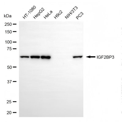Western blotting analysis using IGF2BP3 antibody. Total cell lysates (30 μg) from various cell lines were loaded and separated by SDS-PAGE. The blot was incubated with IGF2BP3 antibody and HRP-conjugated goat anti-rabbit secondary antibody respectively.