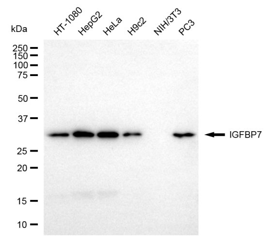 Western blotting analysis using IGFBP7 antibody. Total cell lysates (30 μg) from various cell lines were loaded and separated by SDS-PAGE. The blot was incubated with IGFBP7 antibody and HRP-conjugated goat anti-rabbit secondary antibody respectively.