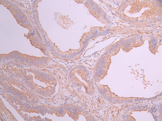 IHC image of CSB-RA184907A0HU diluted at 1:100 and staining in paraffin-embedded human prostate cancer performed on a Leica BondTM system. After dewaxing and hydration, antigen retrieval was mediated by high pressure in a citrate buffer (pH 6.0). Section was blocked with 10% normal goat serum 30min at RT. Then primary antibody (1% BSA) was incubated at 4°C overnight. The primary is detected by a Goat anti-rabbit polymer IgG labeled by HRP and visualized using 0.05% DAB.