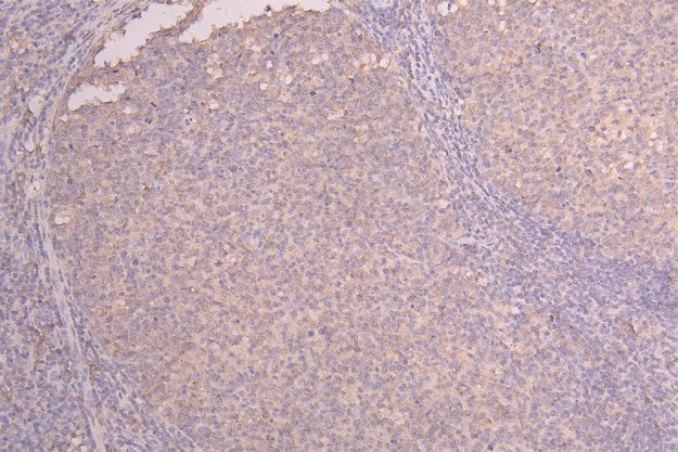IHC image of CSB-RA867113MA1HU diluted at 1:100 and staining in paraffin-embedded human tonsil tissue performed on a Leica BondTM system. After dewaxing and hydration, antigen retrieval was mediated by high pressure in a citrate buffer (pH 6.0). Section was blocked with 10% normal goat serum 30min at RT. Then primary antibody (1% BSA) was incubated at 4°C overnight. The primary is detected by a Goat anti-Human IgG labeled by HRP and visualized using 0.05% DAB.