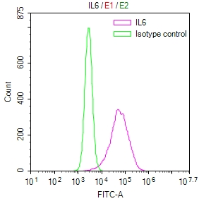 Overlay Peak curve showing 786-O cells stained with CSB-RA011664MA3HU (red line) at 1:100. The cells were fixed in 4% formaldehyde and permeated by 0.2% TritonX-100 for 10min. Then 10% normal goat serum to block non-specific protein-protein interactions followed by the antibody (1ug/1*106cells) for 45min at 4℃. The secondary antibody used was Fluorescein (FITC) AffiniPure Goat Anti-Human IgG, Fcγ fragment specific at 1:200 dilution for 35min at 4℃.Control antibody (green line) was human IgG1 (1ug/1*106cells) used under the same conditions. Acquisition of >10,000 events was performed.