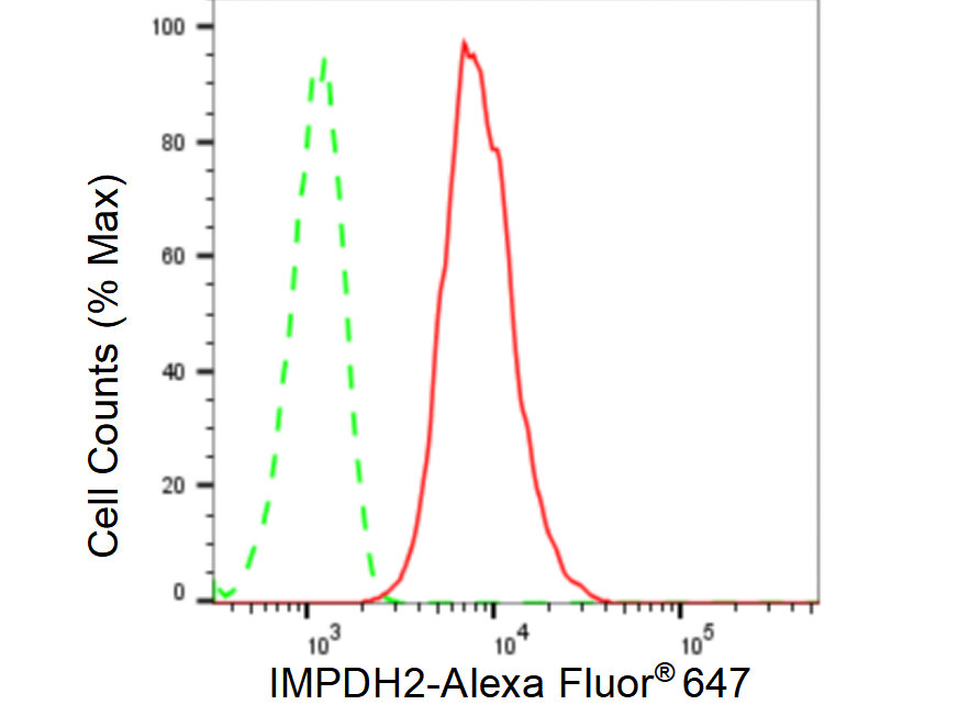 Flow cytometric analysis of IMPDH2 expression in HT-1080 cells using IMPDH2 antibody. Green, isotype control; red, IMPDH2.