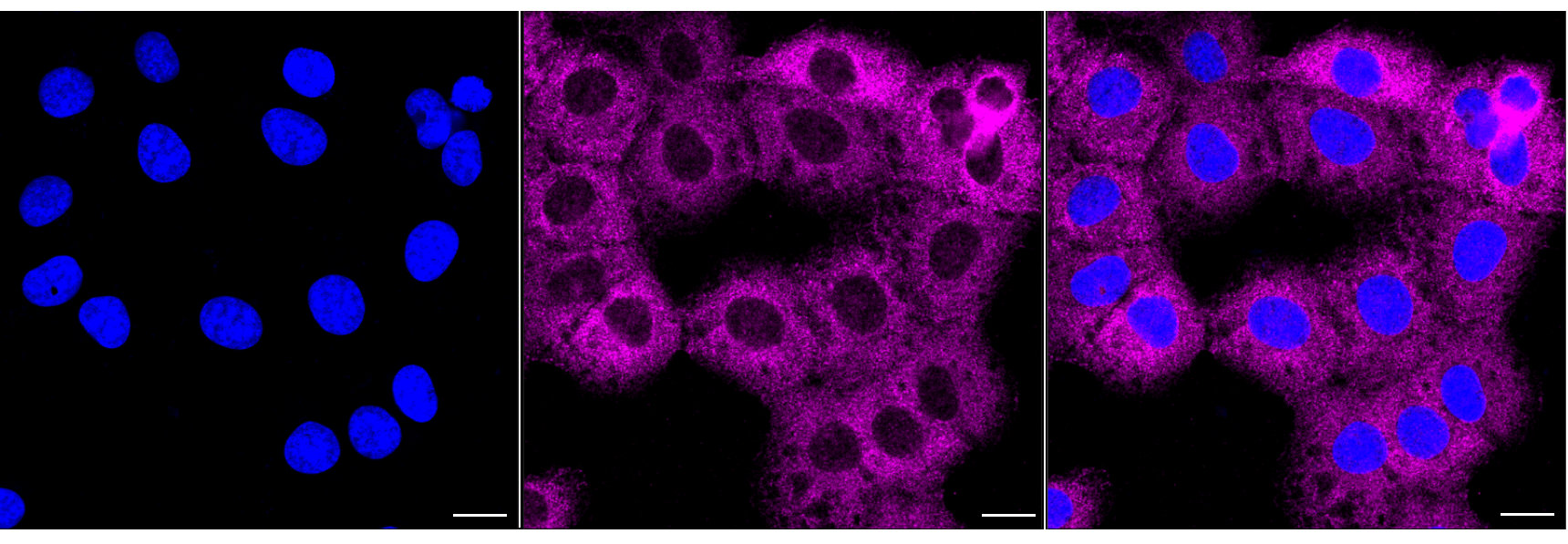 Immunocytochemical staining of HT-1080 cells with IMPDH2 antibody. Nuclei were stained blue with DAPI; IMPDH2 was stained magenta with Alexa Fluor? 647. Images were taken using Leica stellaris 5. Protein abundance based on laser Intensity and smart gain: Medium. Scale bar, 20 μm.
