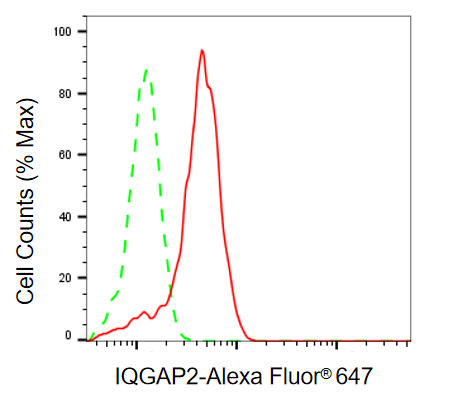 Flow cytometric analysis of IQGAP2 expression in HeLa cells using IQGAP2 antibody. Green, isotype control; red, IQGAP2.
