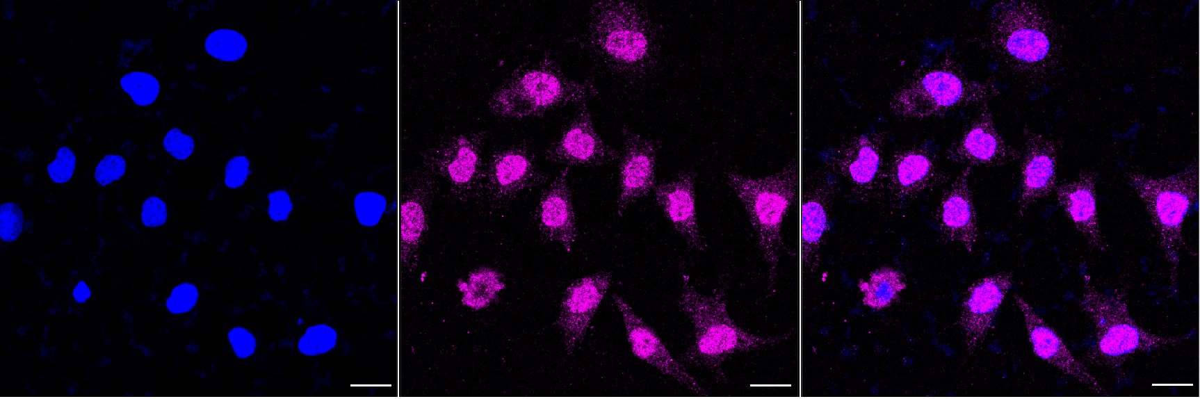 Immunocytochemical staining of HeLa cells with IQGAP2 antibody. Nuclei were stained blue with DAPI; IQGAP2 was stained magenta with Alexa Fluor? 647. Images were taken using Leica stellaris 5. Protein abundance based on laser Intensity and smart gain: Low. Scale bar, 20 μm.