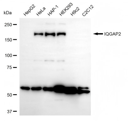 Western blotting analysis using IQGAP2 antibody. Total cell lysates (30 μg) from various cell lines were loaded and separated by SDS-PAGE. The blot was incubated with IQGAP2 antibody and HRP-conjugated goat anti-rabbit secondary antibody respectively.