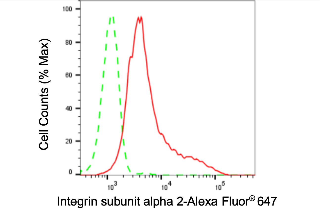 Flow cytometric analysis of Integrin subunit alpha 2 expression in HepG2 cells using Integrin subunit alpha 2 antibody. Green, isotype control; red, Integrin subunit alpha 2.