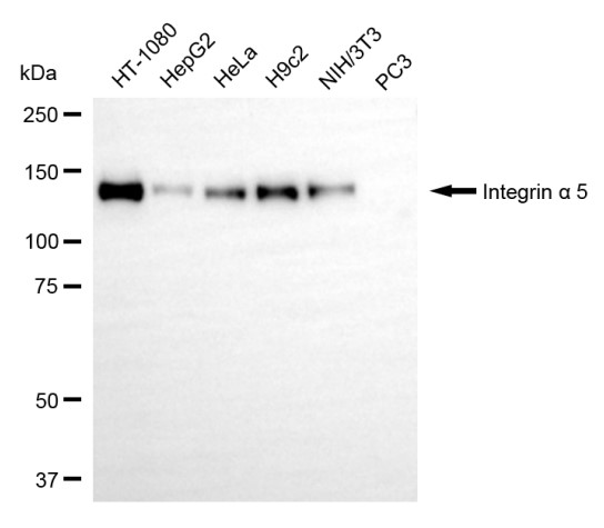 Western blotting analysis using integrin alpha 5 antibody. Total cell lysates (30 μg) from various cell lines were loaded and separated by SDS-PAGE. The blot was incubated with integrin alpha 5 antibody and HRP-conjugated goat anti-rabbit secondary antibody respectively.