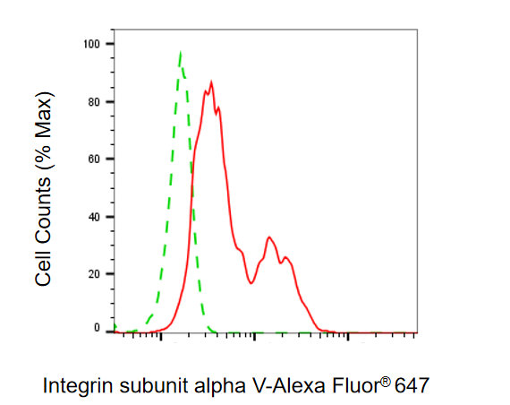 Flow cytometric analysis of Integrin subunit alpha V expression in HeLa cells using Integrin subunit alpha V antibody. Green, isotype control; red, Integrin subunit alpha V.