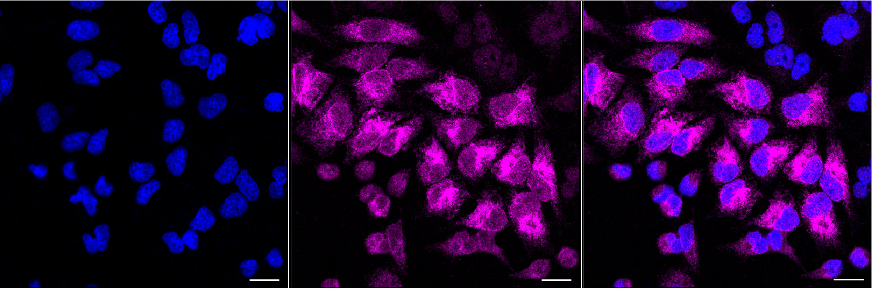 Immunocytochemical staining of HeLa cells with ITGAV antibody. Nuclei were stained blue with DAPI; ITGAV was stained magenta with Alexa Fluor? 647. Images were taken using Leica stellaris 5. Protein abundance based on laser Intensity and smart gain: Medium. Scale bar, 20 μm.
