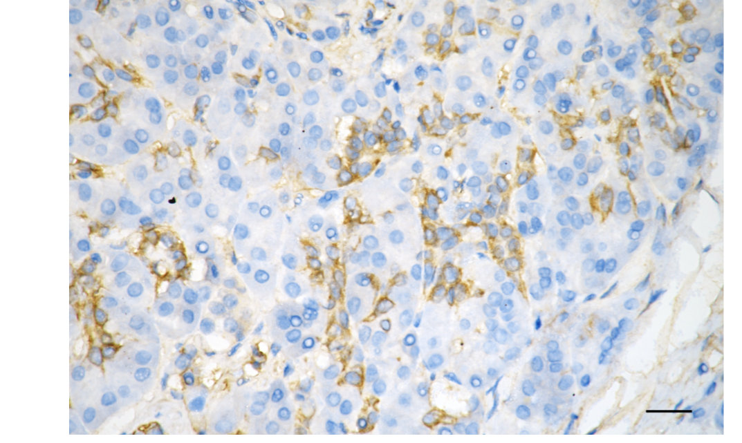 Immunohistochemistry was performed on paraffin-embedded human pancreatic adenocarcinoma using integrin subunit alpha V antibody. Antigen retrieval was done in sodium citrate buffer (pH 6.0). DAB was used for detection, with hematoxylin counterstaining. Images were acquired using a Nikon Ci-L Plus microscope (40× objective). Scale bar: 25 μm.