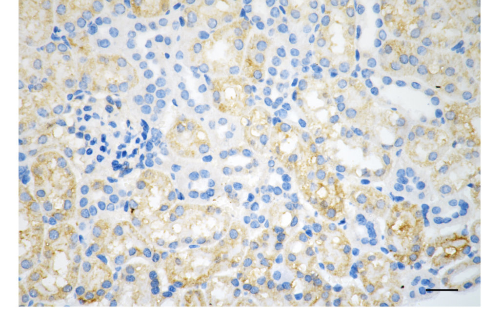 Immunohistochemistry was performed on paraffin-embedded mouse kidney using integrin subunit alpha V antibody. Antigen retrieval was done in sodium citrate buffer (pH 6.0). DAB was used for detection, with hematoxylin counterstaining. Images were acquired using a Nikon Ci-L Plus microscope (40× objective). Scale bar: 25 μm.