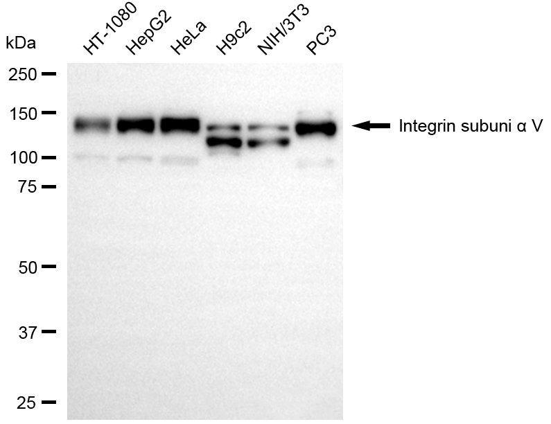 Western blotting analysis using integrin subunit alpha V antibody. Total cell lysates (30 μg) from various cell lines were loaded and separated by SDS-PAGE. The blot was incubated with integrin subunit alpha V antibody and HRP-conjugated goat anti-rabbit secondary antibody respectively.